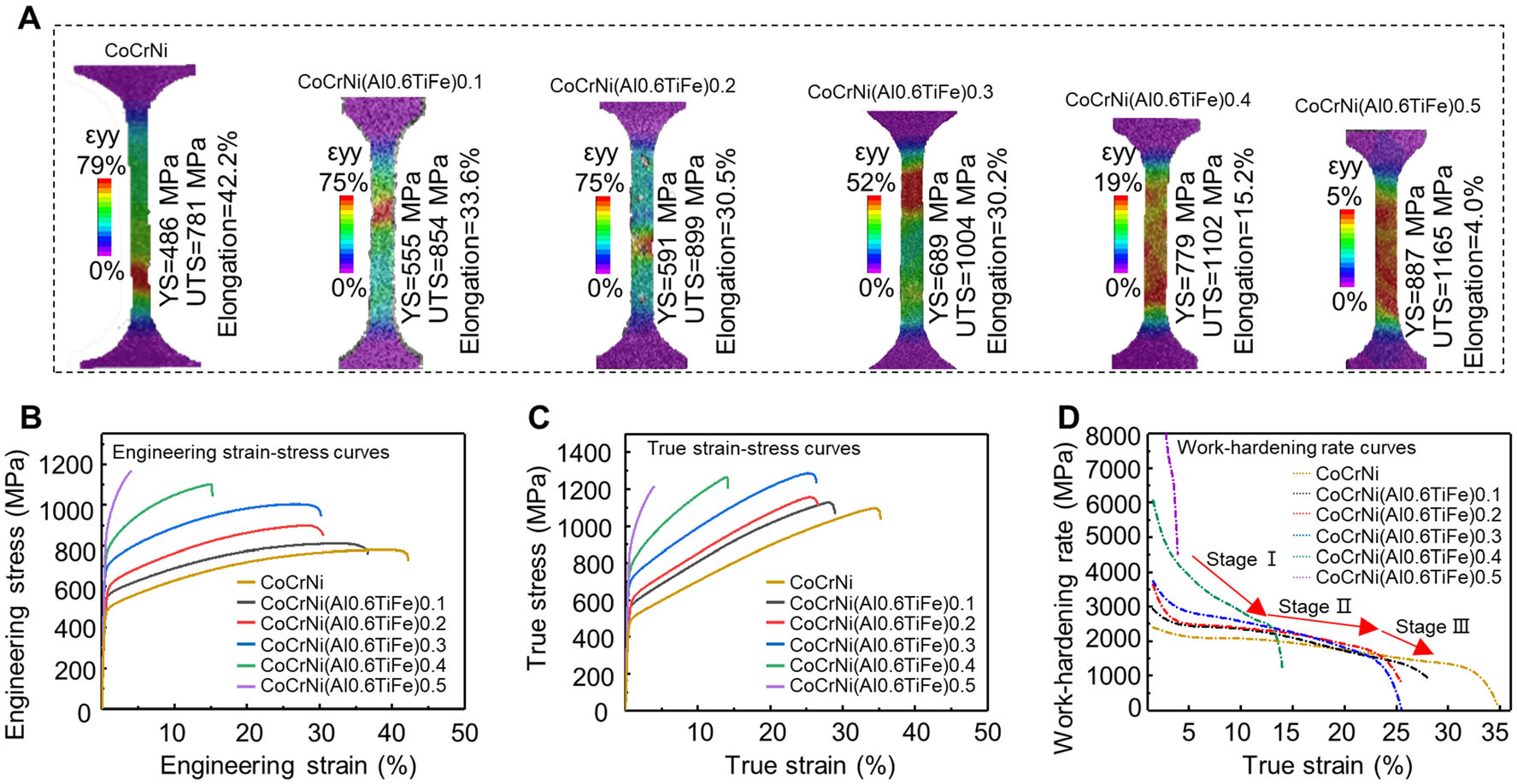 图1 激光辅助增材制造合金的力学性能:(A) DIC应变分布图;(B) 工程应力-应变曲线;(C) 真实应力-应变曲线;(D) 加工硬化率曲线